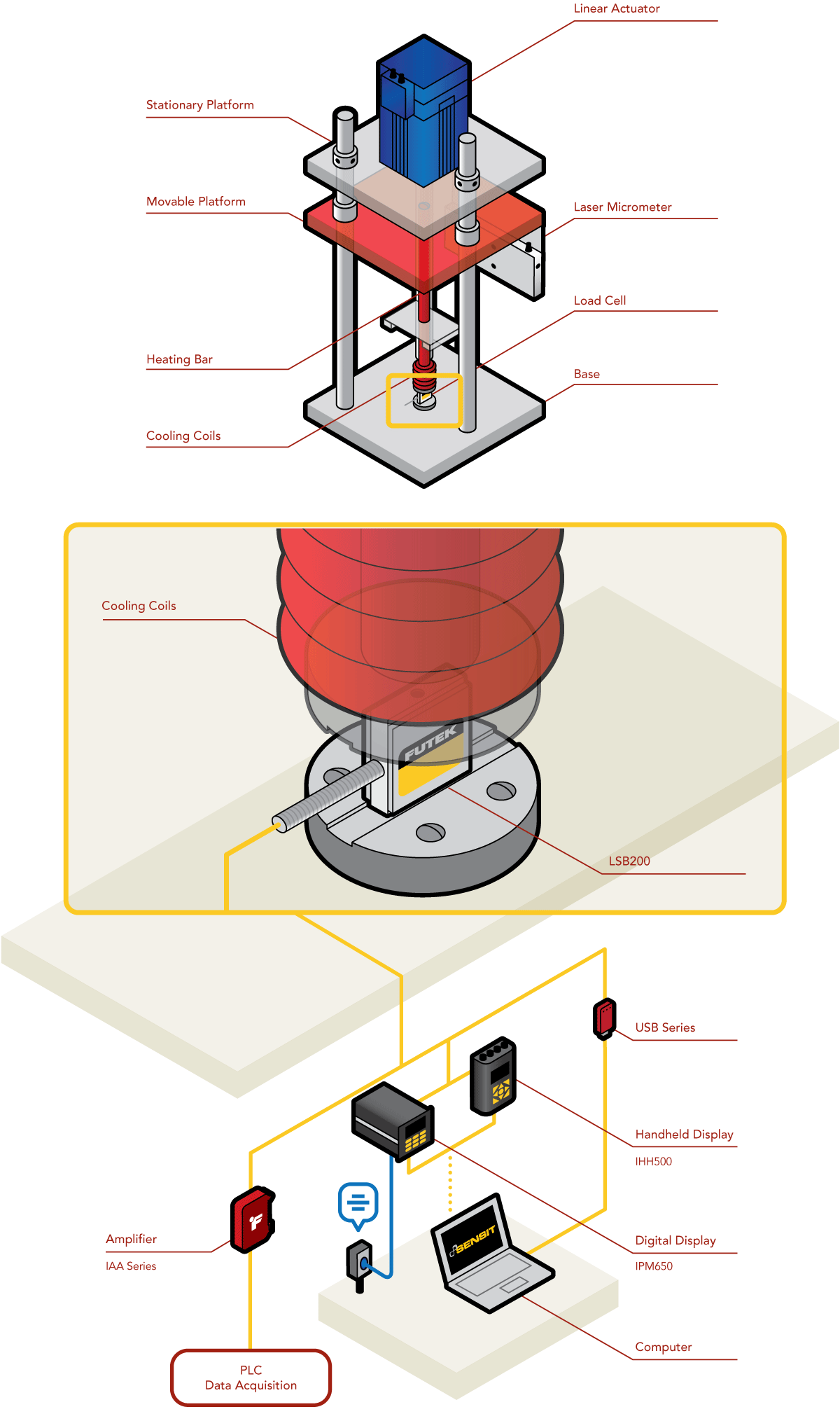 2、开云(中国) LSB200微型S型传感器安装在测力台架的底部,正对着加热棒和冷却盘管下方。LSB200传感器特殊的设计,使得传感器在台架加热和冷却降温的过程中,测试结果不受影响。