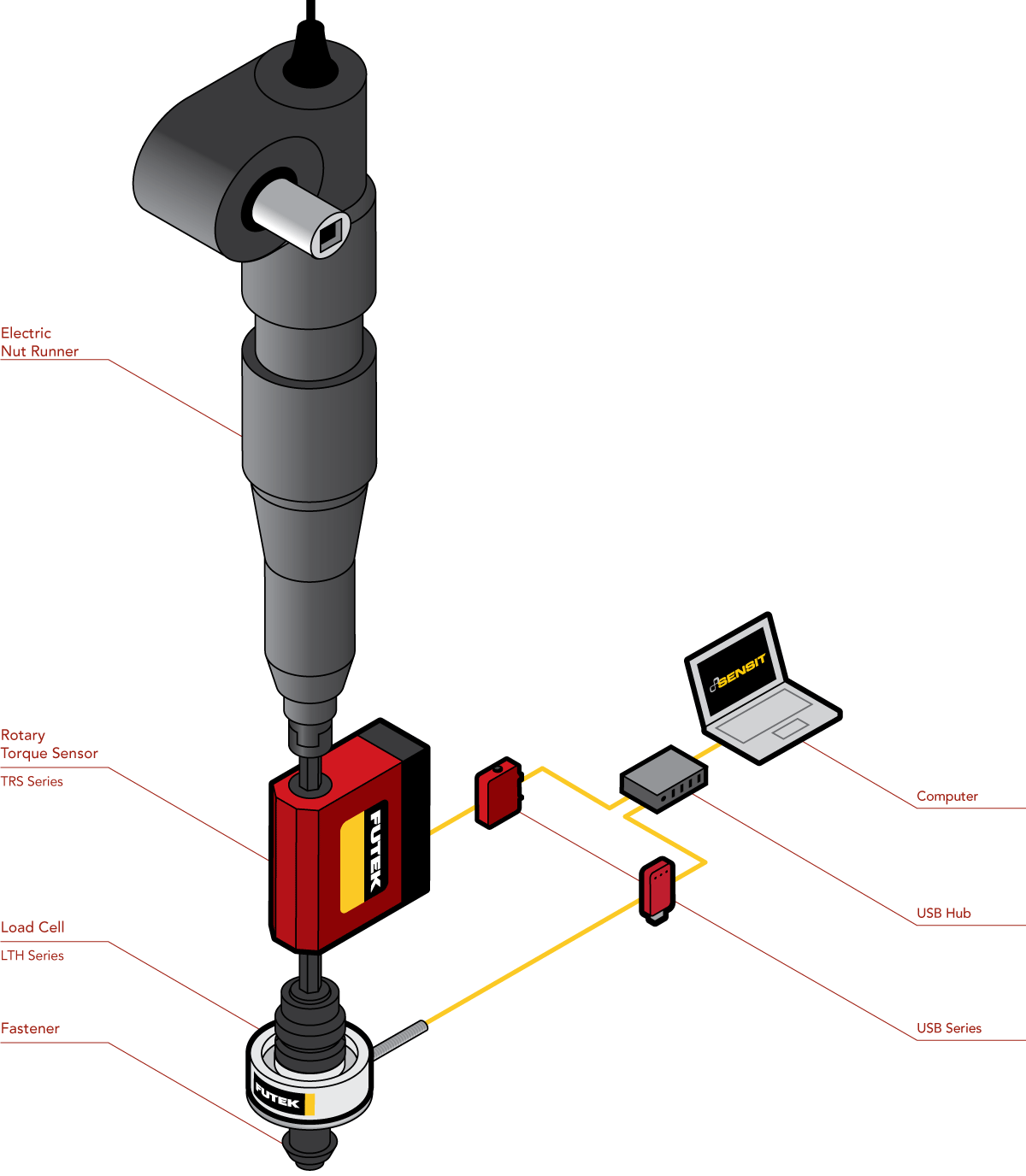 中空型力传感器(LTH系列)、动态扭矩传感器,及与之配套使用的开云(中国) USB采集方案、SENSIT软件。