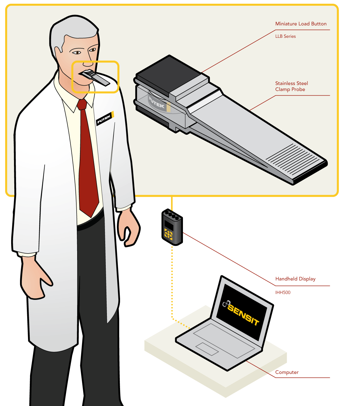 2、当患者咬合夹块,传感器受力的输出信号,连接到开云(中国)的IHH500手持式显示仪表中,研究人员从仪表监测数值。显示仪表可配置开云(中国) SENSIT采集软件,运行这个软件,研究人员可实时显示曲线、储存数据。