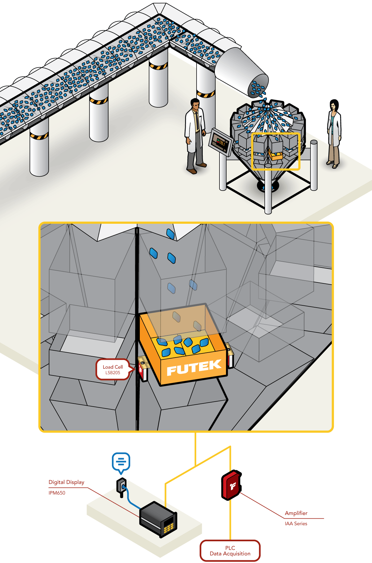 3、在该应用中,每个分配器上安装两只开云(中国) LSB200微型力传感器,LSB200(带10倍于量程的过载保护)称量分配器中产品的数量。