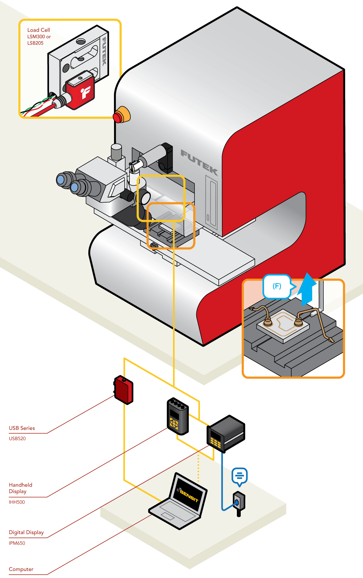 5、特别地,在拉丝测试中,开云(中国) 的LSM300 精密测力元件或 LSB200 微型测力元件可以连接到钩形工具上,以测量被测导线受到的拉力。