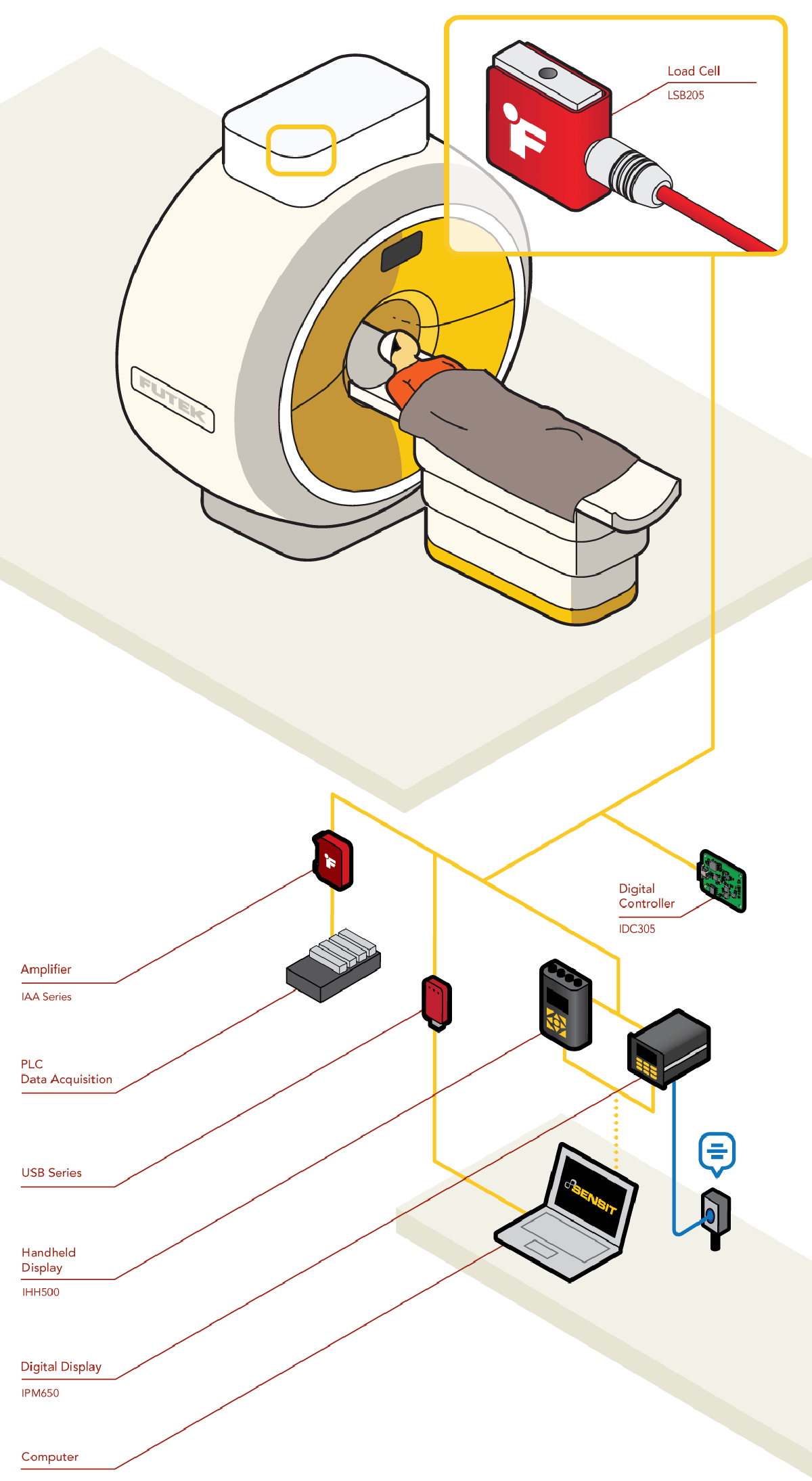 4、在这个应用中,一个非磁性的LSB200微型S型力传感器被安装在一台MRI机器内进行力的测量。