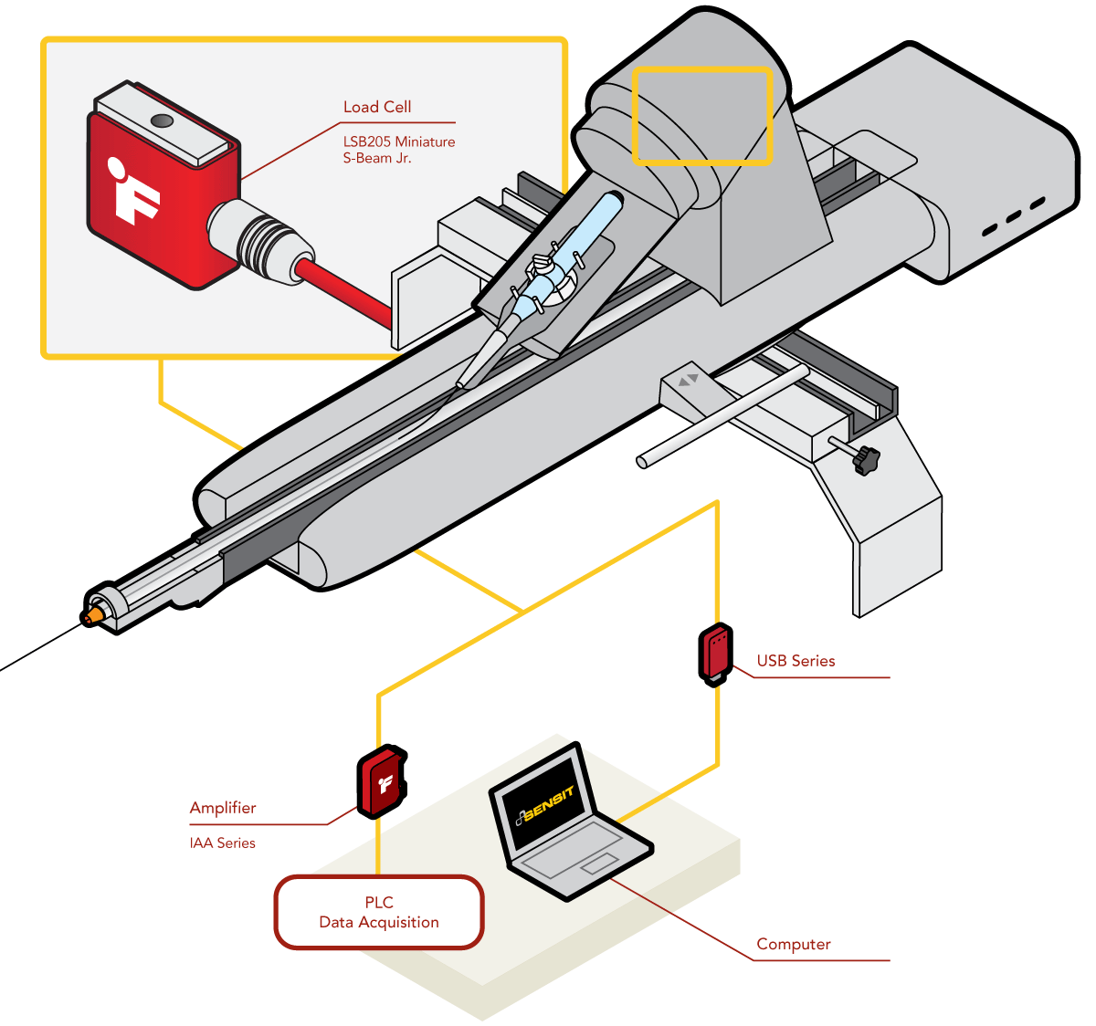 3、在上面的应用中,一个 S 型测力传感器(LSB200)位于从机器人手臂延伸的导丝上。LSB200 测量导线上的张力,这些信息用来控制导管的方向和运动。